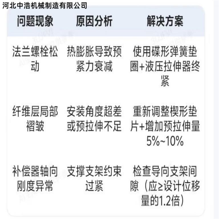 纖維織物補償器在安裝時避免不了安裝誤差,為了解決安裝誤差問題中浩機械總結主要可從安裝前零誤差測量和定位到預變形量調整,其次對支撐結構進行優(yōu)化,分階段緊固與應力調整,安裝后進行試驗測試,從而總結常見問題及解決方法。