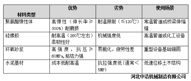 力學性能主要體現(xiàn)在彈性模量和抗拉抗壓強度以及斷裂韌性,低彈性材料柔韌性好可適應較大位移變形,減少應力集中,高彈性材料(如混凝土)易因剛性過渡而開裂。抗拉抗壓強度高強度材料如(環(huán)氧樹脂)可承受更大載荷和頻繁位移,使用壽命長。而低強度材料易在動態(tài)載荷下疲勞損壞。針對斷裂韌性問題,可用高韌型材料,可抑制微小裂紋引起的斷裂。從耐久性考慮高溫環(huán)境載300℃以上可選用硅酮膠等耐溫材料,普通材料極易發(fā)生脆化??紤]耐化學腐蝕化工廠環(huán)境需要抗酸堿材料,例如氟橡膠,避免腐蝕失去密封性。而耐腐性需要選擇對紫外線敏感材料如(聚氨酯)添加抗老劑,避免使用開裂現(xiàn)象??紤]界面強度和搜索率,如低粘性材料(如普通水泥砂漿)極易與金屬基體脫粘,導致滲漏。而高收縮材料(如固化環(huán)氧樹脂)可能因收縮應力引發(fā)斷裂,需要添加膨脹劑。從膨脹系數(shù)考慮,不同材質(zhì)不同。從施工適應性考慮流動性和固化時間,狹窄縫隙需高流動材料,可用自流平聚合物,確使填充緊密。從固化時間考慮,如果搶修時間短可用雙組分聚氨酯,凝聚時間較短。但需要控制施工進度。一般情形可參照材料對比表: